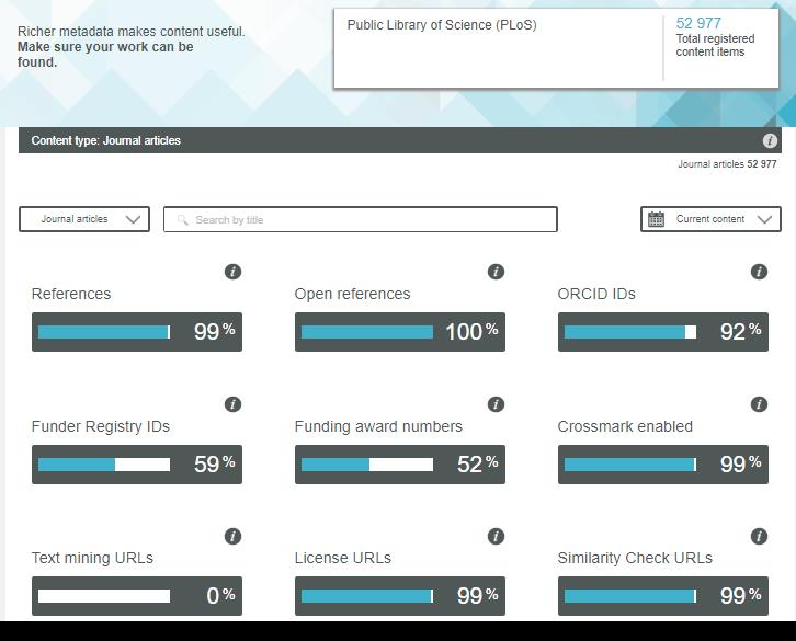В начале своей деятельности CrossRef ограничивался минимальным набором метаданных для регистрации DOI. В число обязательных элементов не включалось даже заглавие публикации [5, 6]. С годами полнота и точность метаданных приобретала все большее значение. Конференция CrossRef 2018 года "How good is your metadata" была посвящена качеству метаданных, поставляемых в базу CrossRef. Сейчас в универсальных метаданных Crossref (применимых ко всем типам контента) выделяются базовые (заглавие, автор, даты публикации, название источника, том, выпуск, страницы, электронный адрес) и расширенные, к числу которых относятся рефераты/ аннотации, списки использованной литературы, информация о лицензиях, фондах, аффилиации и ORCID авторов, связях с другими публикациями и другие. Причем количество записей, содержащих расширенный набор метаданных, устойчиво растет. Специальный сервис Participation Reports с визуализацией (https://www.crossref.org/members/prep/) позволяет получить картину расширенного состава метаданных в ресурсах организации-члена CrossRef, как показано на рисунке 1. Кроме того, CrossRef обогащает метаданные, переданные организацией при регистрации DOI, дополняя их новыми выявленными связями (например, между оригиналом и переводом, статьей и набором данных), информацией о фондах, классификационными кодами журналов Scopus и другими. Осознавая важность расширенного состава метаданных для поиска публикаций и анализа публикационных процессов, издатели не только включают их в текущие регистрации, но и активно добавляют в ранее сформированные метаданные. Как показано в [6], по состоянию на 2019 год метаданные, зарегистрированные в период с 2013 по 2016 год, подверглись корректировке в 80% случаев.